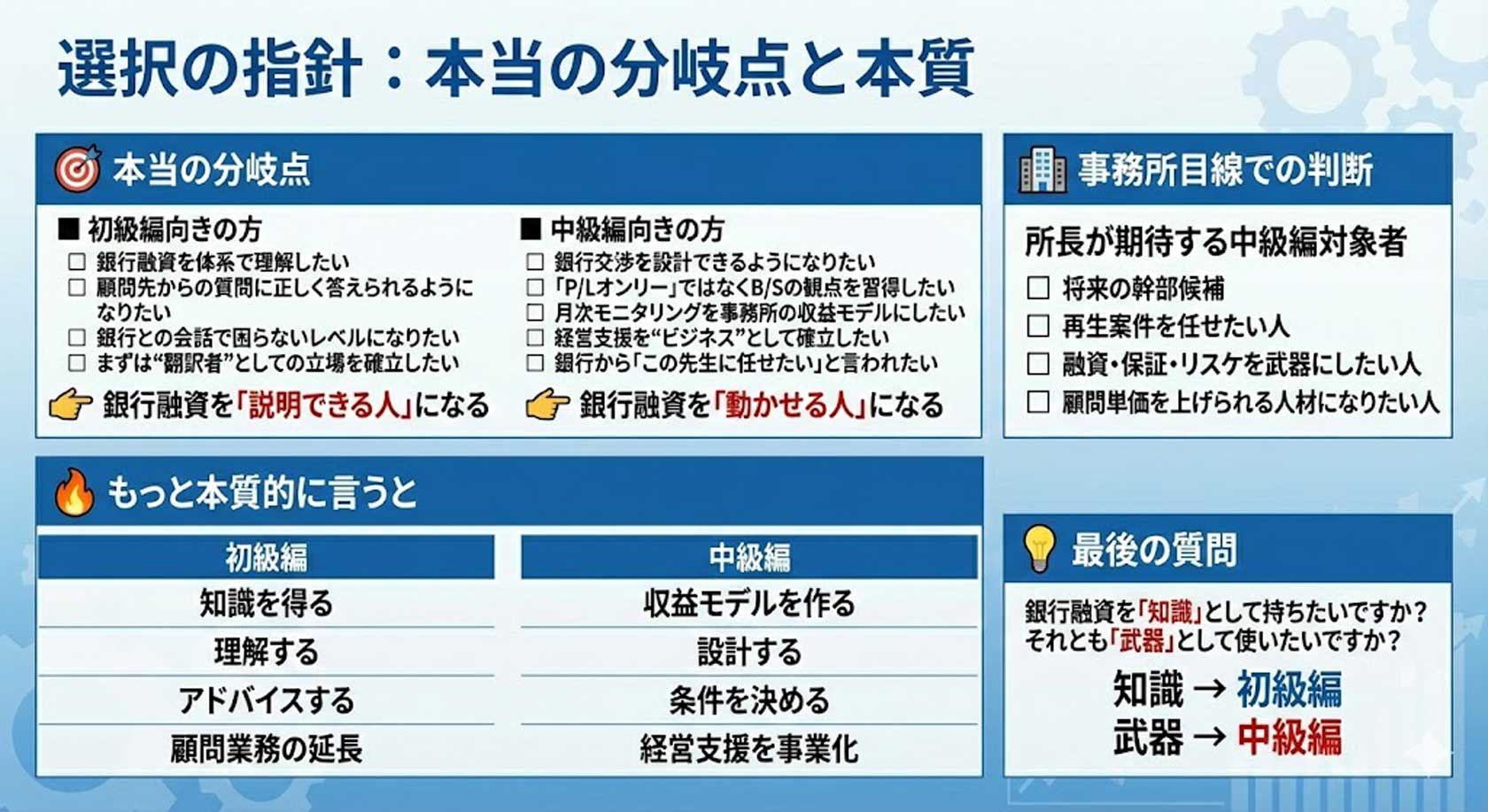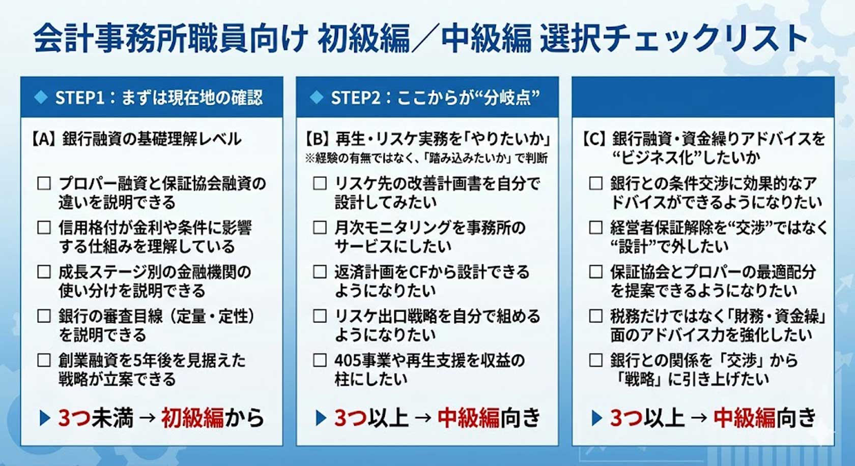 新設する「初級編」には会計事務所に入所されて間もない方や銀行融資が全くわからない方でも分かりやすく理解できるプログラム内容に改訂しております。