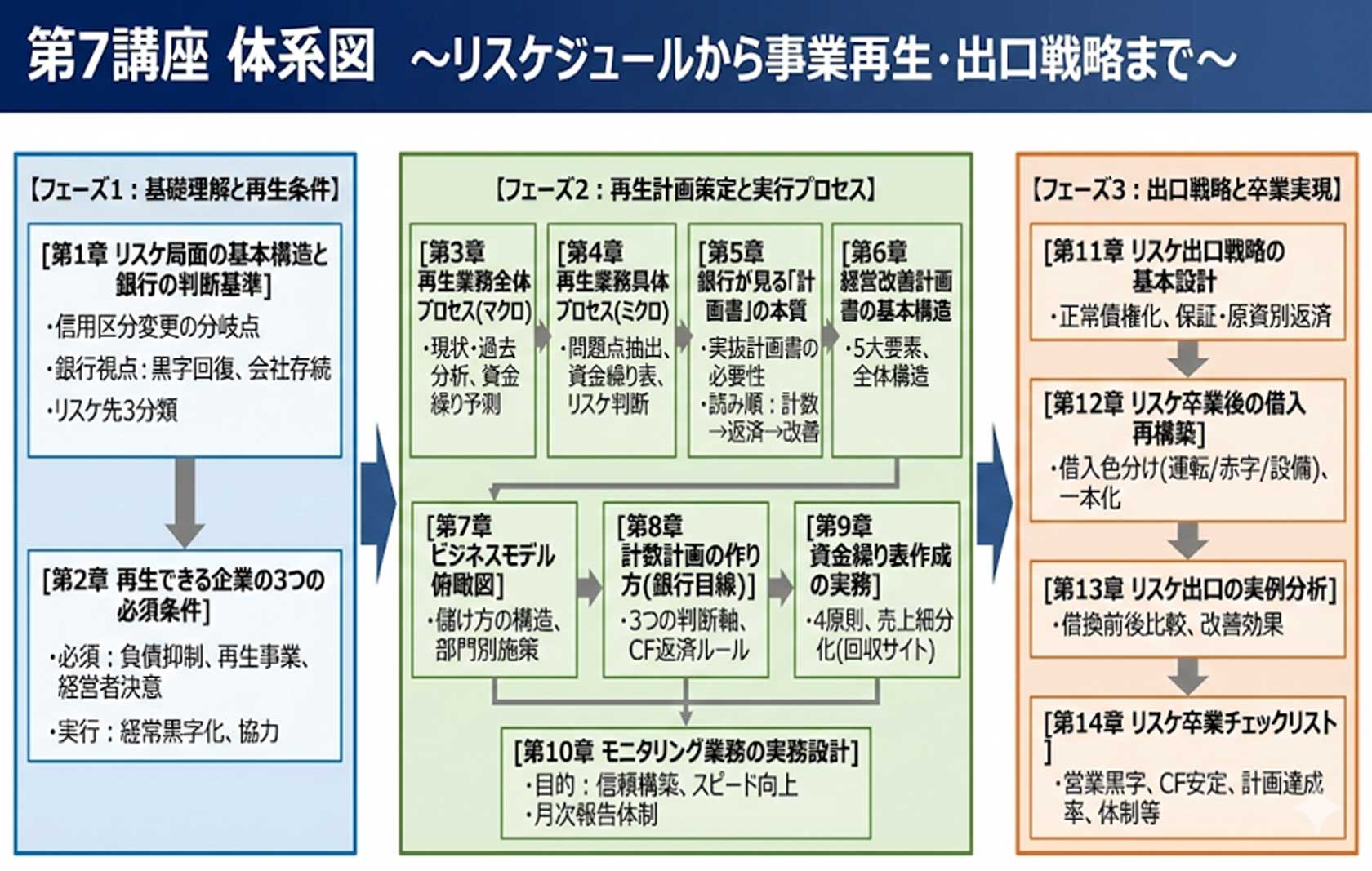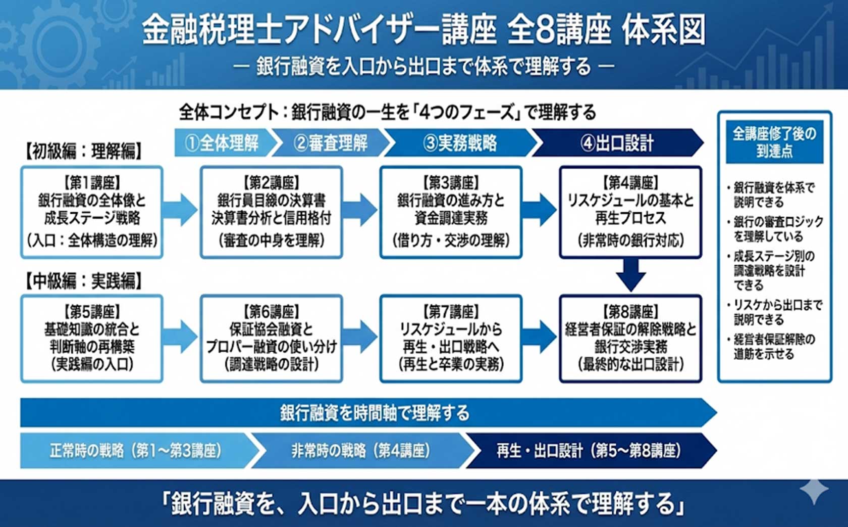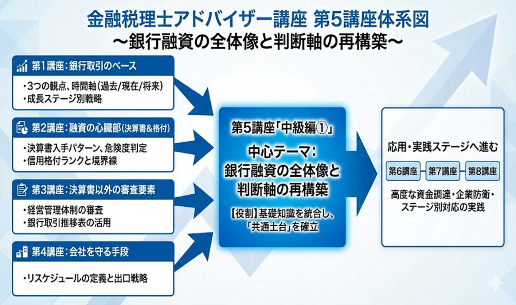 また「中級編」では「初級編」の復習を第5講座に入れて「初級編の知識」を再構築したうえでプロパー融資と保証協会融資の使い分け、リスケジュールで必要な改善計画書作成ノウハウ、事業性評価制度、リスケの出口設計、経営者保証ガイドラインなどより現場で顧問先の経営者の相談役になれる内容にしております。